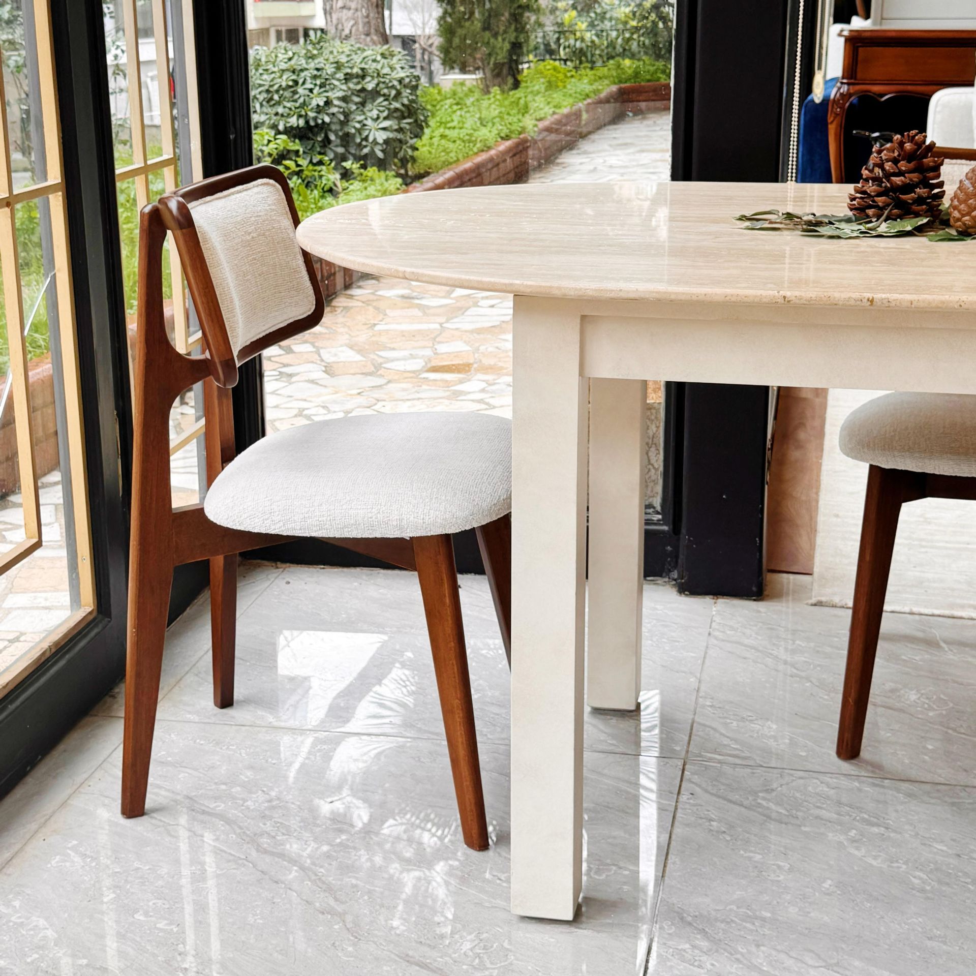• Doğal Traverten Üst Yüzey: Eşsiz dokusu ve dayanıklılığı ile zamansız bir tasarım sunar. Her traverten yüzey kendine özgü damar ve desenlere sahiptir, böylece her masa benzersizdir.